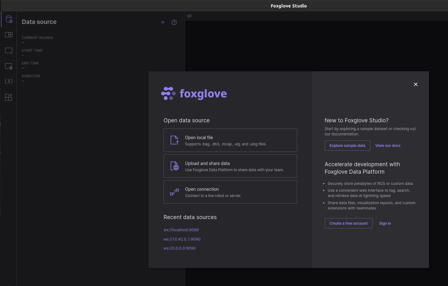 In Foxglove, click the top button in the sidebar, labeled Data source. Then select the Plus button in the left panel. This should open up an interface to connect to data. Click the Open Connection button.