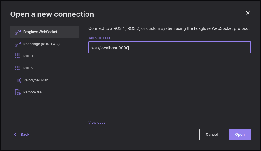 Select Rosbridge (ROS 1 & ROS 2) as shown below. Fill out the WebSocket URL with the url and port that the simulator output before. Then, click Open in the bottom right corner.